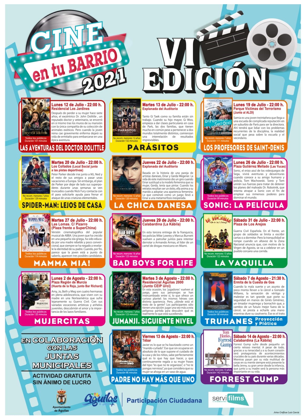 Esta mañana, el edil de Participación Ciudadana, Juan Andrés Torres, ha presentado la VI edición de “Cine en tu barrio”, que este año cuenta con varias novedades. Además de las películas que se proyectarán en los diferentes parques de los barrios aguileños y que han sido elegidas por las juntas vecinales, este verano los mayores de las residencias de ancianos de la localidad también podrán disfrutar de proyecciones cinematográficas. “Los mayores lo han pasado muy mal durante la pandemia y hemos querido tener con ellos el detalle de que disfruten de una proyección de cine”. Otra novedad es que, en las pedanías de Los Arejos y La Marina de Cope, concretamente en la Cuesta de Gos, además de la proyección de una película, se hará un coloquio posterior que se ha llamado “Cine y plática”.