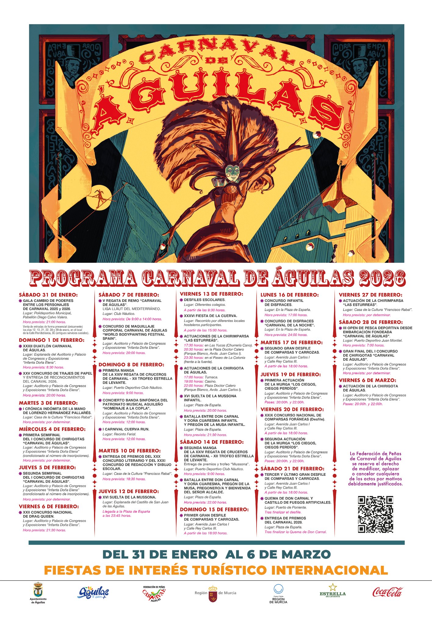 EXPOSICIÓN "COLORES DE TU ESENCIA" Del 6 al 27 de febrero.De lunes a viernes de 18 a 21 horas.Casa de Cultura Francisco Rabal. Programación Carnaval de Águilas 2026 Del 31 de enero al 6 de marzo.