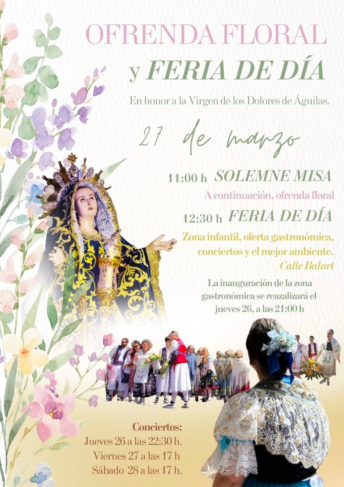 El viernes 27 de marzo, día de la patrona, se concentrarán los principales actos tradicionales. A las 11:45 horas tendrá lugar el pasacalles huertano que recorrerá las principales calles de Águilas, con salida desde el Paseo de la Colonia hasta la plaza de España, culminando con la ofrenda floral a la Virgen de los Dolores.