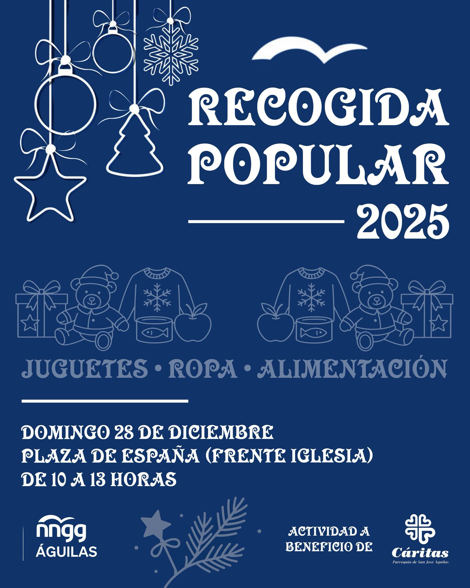 Nuevas Generaciones del Partido Popular de Águilas ha organizado una recogida solidaria de juguetes, ropa y alimentos que se celebrará el domingo 28 de diciembre, en la Plaza de España (frente a la Iglesia de San José), en horario de 10:00 a 13:00 horas.