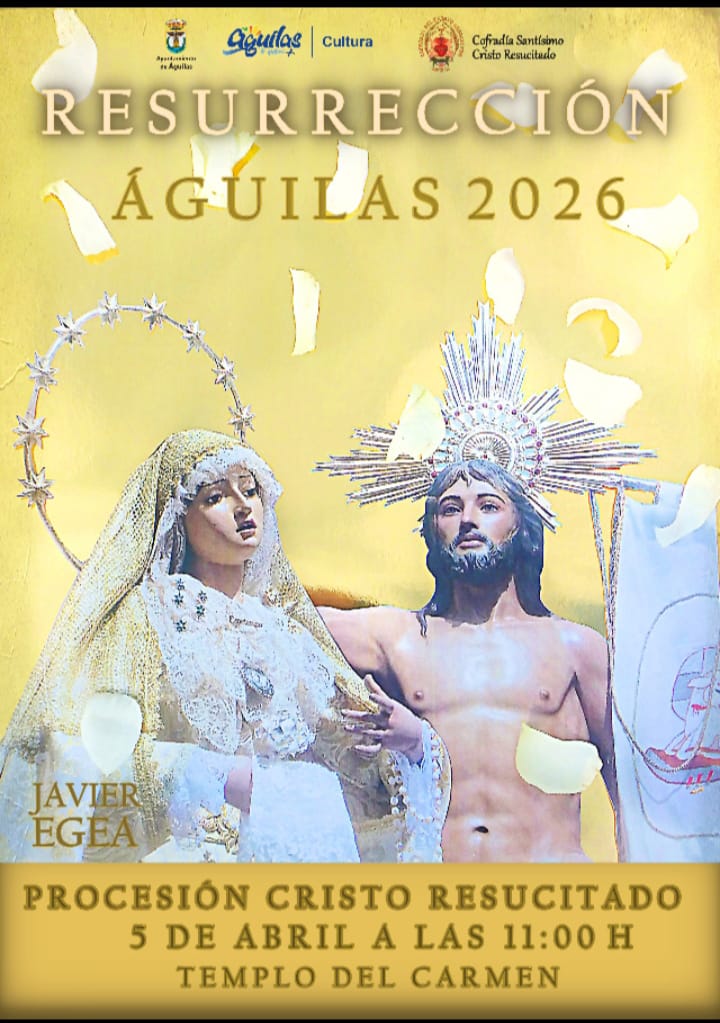 El cartel anuncia la procesión del Cristo Resucitado, que tendrá lugar el próximo 5 de abril a las 11:00 horas, con salida desde el Templo del Carmen, uno de los enclaves principales de la Semana Santa de Águilas.