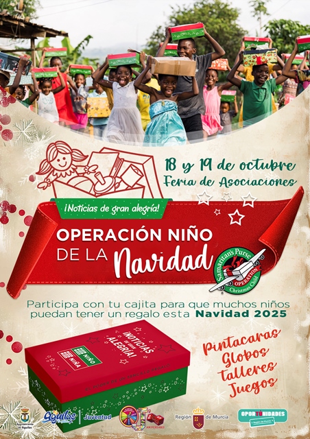 Cada año millones de cajitas de zapatos llenas de regalos (material escolar, artículos de higiene personal y juguetes) se distribuyen a los niños y niñas más necesitados del mundo. Estas cajitas son donadas por personas que demuestran su amor y solidaridad llenándolas con productos nuevos y llevándolas a los puntos de entrega que hay por toda la península. En el caso de Águilas, este año, al igual que el pasado, el Ayuntamiento de Águilas vuelve a sumarse al proyecto solidario entregando las cajas a los colegios de la localidad, así como siendo punto de venta de cajitas para que los interesados puedan llenarlas con sus regalos y entregarlas allí mismo o en su Iglesia más cercana. “Si no has recogido tu cajita, aún estás a tiempo, ya que la fecha máxima de entrega es el 28 de noviembre”.